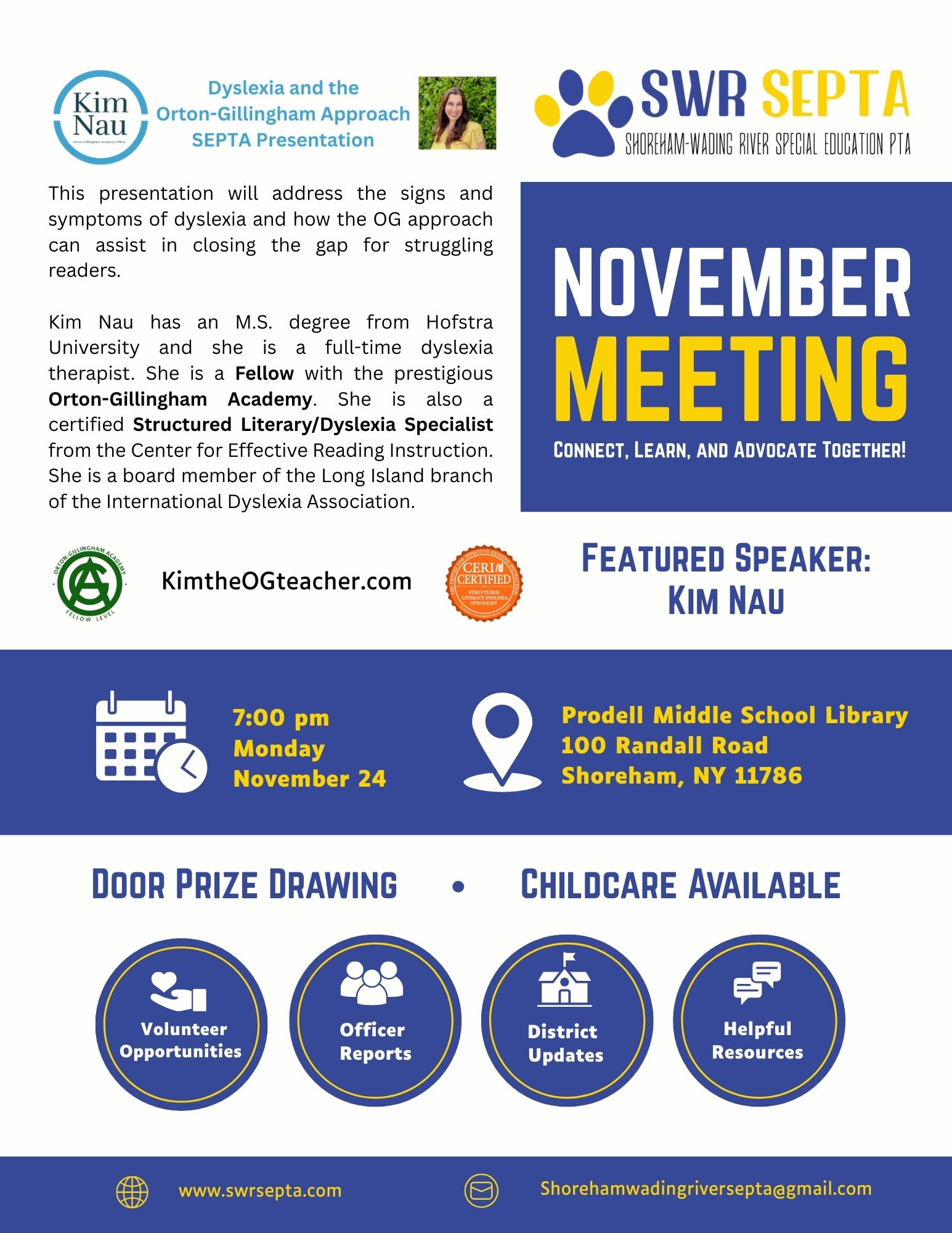 Tomorrow's SEPTA meeting will feature Kim Nau who will address the signs and symptoms of dyslexia and how the OG approach can assist in closing the gap for struggling readers.